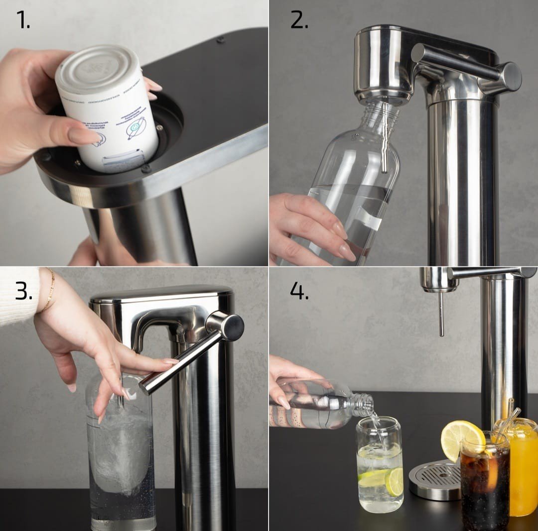 • SodaDream Steel piesātinātāja intuitīvā svira ļauj dažu sekunžu laikā pārvērst parasto ūdeni par perfekti gāzētu dzērienu. Viena vienmērīga kustība un viss ir pabeigts.
